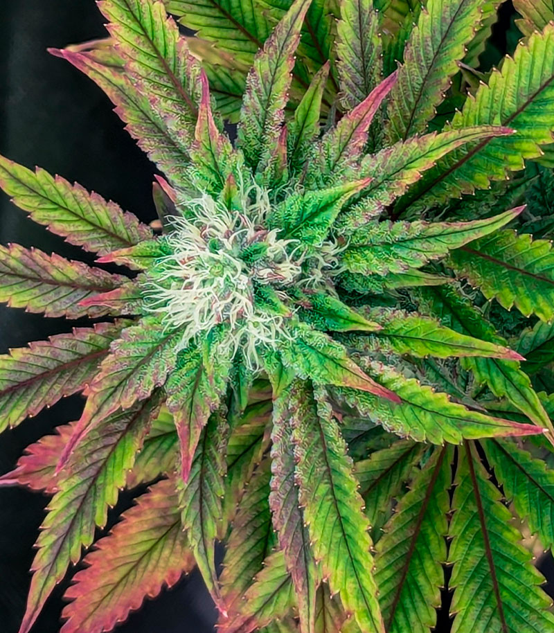 Отдельный повод для восхищения сортом Black Cherry Gushers – это внешняя эстетика растений. Вытянутые соцветия, состоящие из крупных чашечек, завораживают своим лесным темно-зеленым цветом и торчащими во все стороны яркими оранжевыми волосками. Где-то за 2-3 недели до сбора урожая бутоны начинают темнеть, из-за чего они еще больше контрастируют с серебристыми трихомами и мятными веерными листьями в нижней части куста.