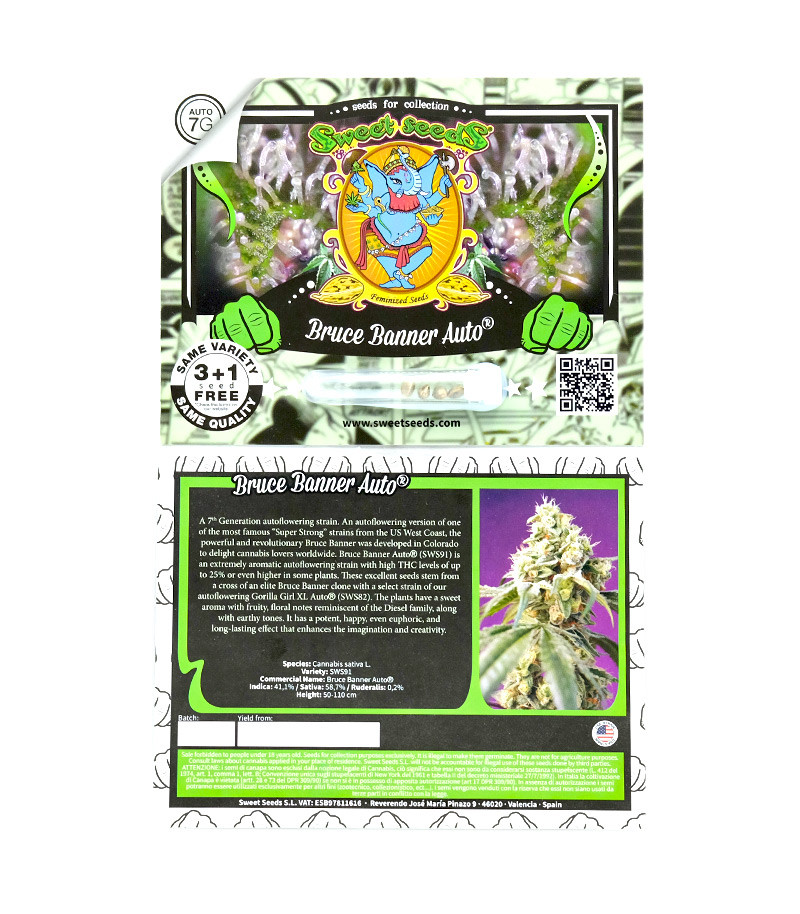 Сорт конопли Bruce Banner Auto является первоклассным автоцветом седьмого поколения. Он был получен путем пересечения знаменитого одноименного фотопериодного растения, родиной которого считается американский штат Колорадо, с не менее прославленным урожайным гибридом Gorilla Girl XL Auto. Его генетический код на 60% состоит из генов сативы, что наделяет его уникальными качествами этого вида каннабиса. Растение отличается изысканными сладкими вкусоароматическими качествами и высоким показателем ТГК в 18-25%. Оно подойдет широкому кругу гроверов, но особенно представителям творческих профессий. Все дело в творческом эффекте, стимулирующем воображение и побуждающем к действию.