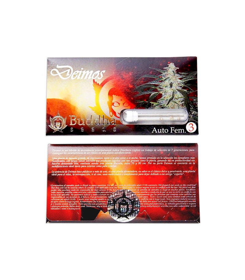 Генетика сорта Deimos ведет свою историю от одной из лучших разновидностей марихуаны афганки. Сорт был получен при помощи селекции как минимум семи поколений гибридов сорта Northern Lights и тщательно подобранного качественного растения типа рудералис. В результате получилось урожайное автоцветущее растение со сладко-острым вкусом.