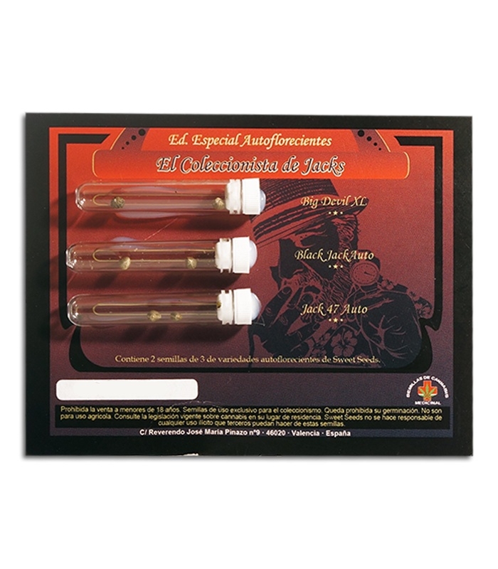 Микс семян Ed. Especial Autoflorecientes - El Coleccionista de Jacks – упаковка из трех автофеминизированных семян, созданных на основе Jack Herer, а именно: цитрусовый Black Jack Auto с нокаутирующим эффектом; возвышающий Jack 47 Auto с мускусным ароматом; сладкий Big Devil XL с оглушающим хаем.