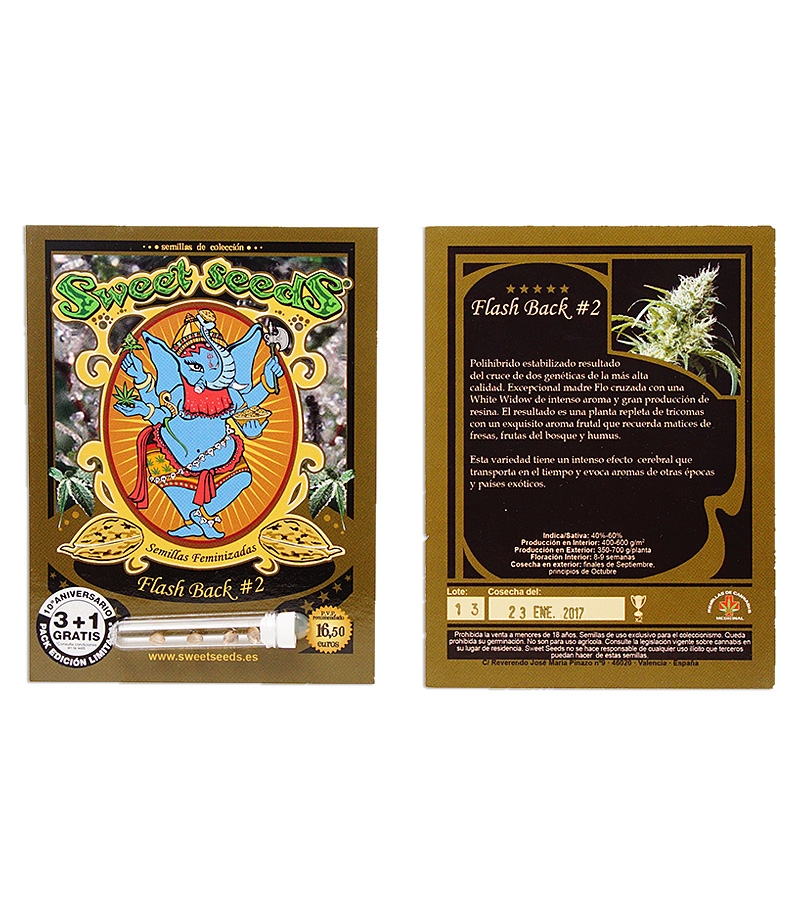 Генетика сорта Flash Back #2 является результатом скрещивания классического сорта White Widow с красочным сортом Flo. В результате получилось растение с генетикой, на 60% состоящей из свойств индики, на 40% - из сативы. Свой яркий аромат и способность производить смолы Flash Back #2 унаследовал от White Widow, а от Flo новому гибриду досталось обильное покрытие трихомами.