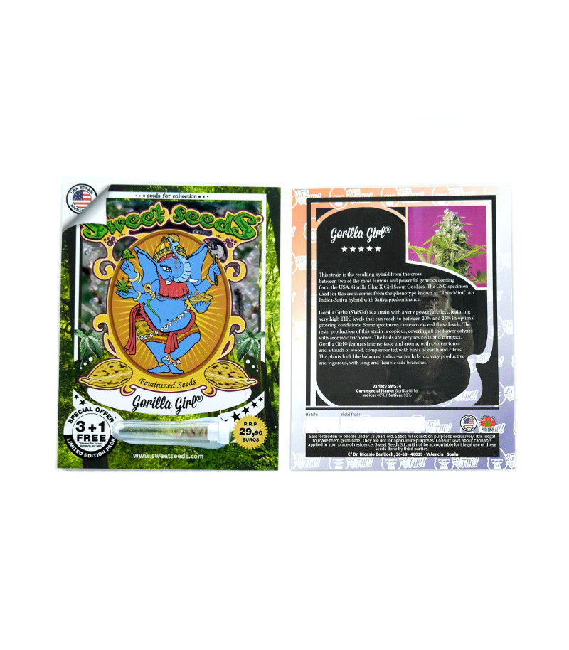 Семена растения Gorilla Girl это новинка известного испанского банка Sweet Seeds. Это гибрид с небольшим преобладанием сативы, который способен достигать уровня ТГК 25%. В помещении растение приносит до 550 грамм каннабиса, в ауте урожай достигает 600 грамм с куста. Вкус свежих цитрусовых и хвои.