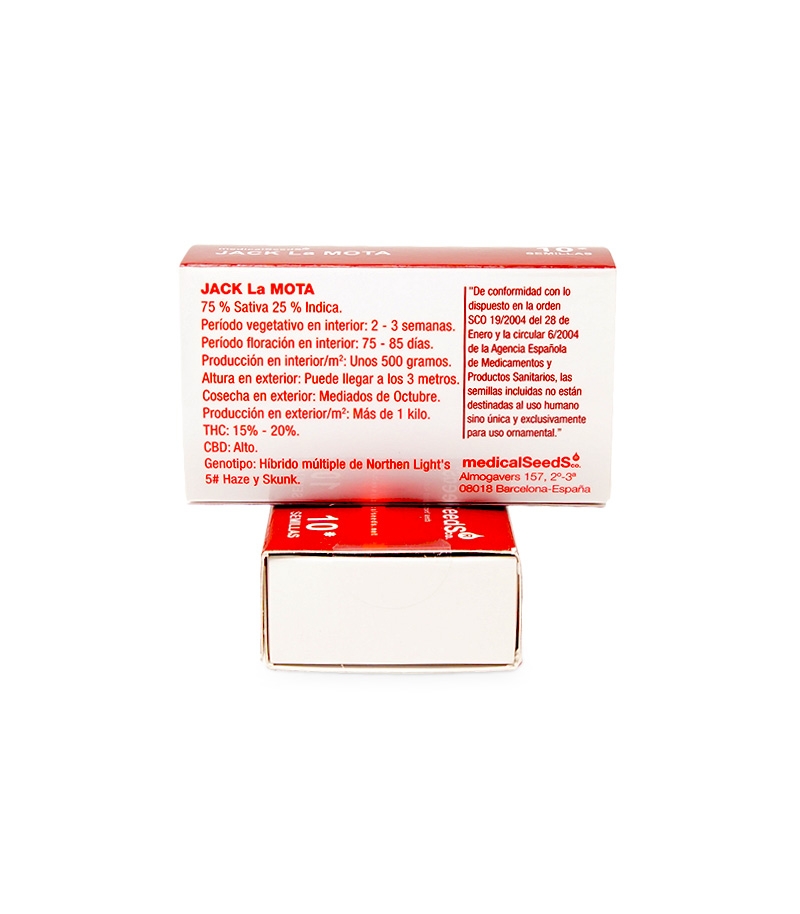 Работая над этим сортом, селекционеры Medical Seeds создали множественный гибрид на основе Northern Lights #5 Haze с американскими корнями и традиционного сативного сорта Skunk. Полученное растение обладает компактной структурой с высокими побегами и длинным периодом цветения конопли. От своих родителей сорт Jack La Mota унаследовал интенсивный аромат и уникальный вкус. В генотипе сорта может содержаться до 25% индики.