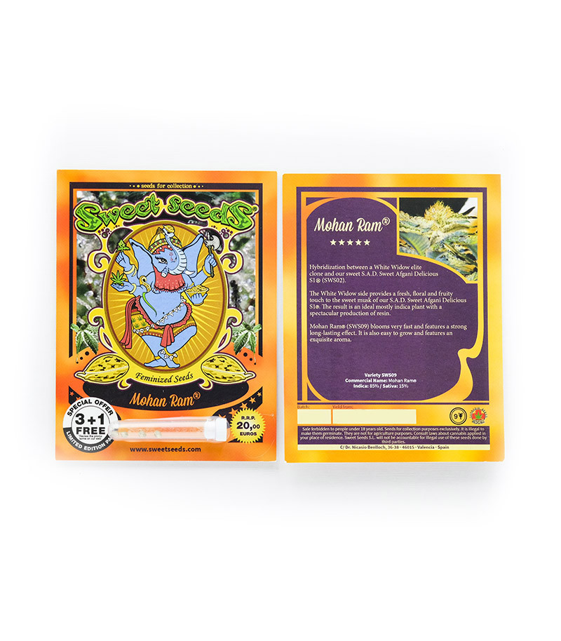 Семена марихуаны Mohan Ram – быстроцветущее растение с экзотическим запахом специй и обильной кристаллизацией. Был получен скрещиванием «Белой вдовы» и сорта S.A.D.-S1. В генетике преобладает индика, что проявляется и в росте, и в воздействии. При ТГК 18-21% очаровывает своей силой и длительностью.