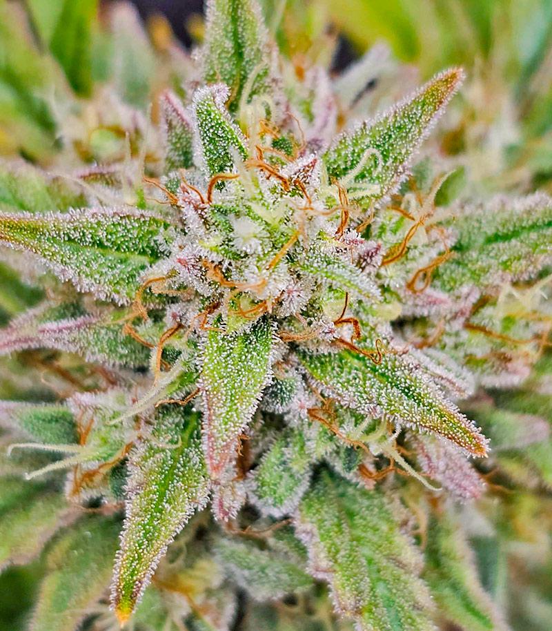 Соцветия Peach Crescendo Auto RF3 обладают особой магией. Насыщенный зеленый цвет бутонов выступает фоном для снежно-белого ковра из трихом и частых вкраплений длинных пестиков, которые выбиваются из общей картины своим ярким рыжим цветом.