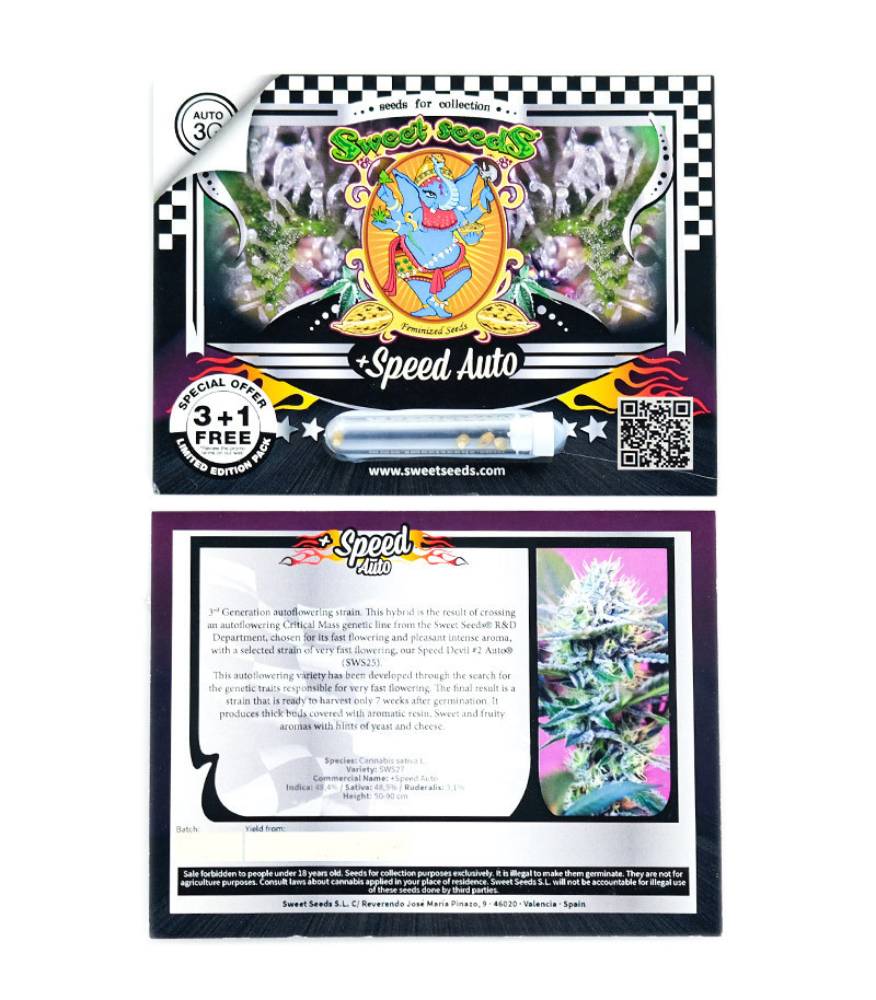 Сорт +Speed Auto был выведен в качестве экспериментального в ходе исследовательской работы селекционеров из Sweet Seeds. Главной задачей бридеров было определение генетических признаков, отвечающих за короткий период цветения и способность производить урожай за 49 дней после прорастания. Чтобы получить быстроцветущий автоцвет, были скрещены обладатель насыщенного аромата Auto Critical Mass и "быстрый" Speed Devil #2.