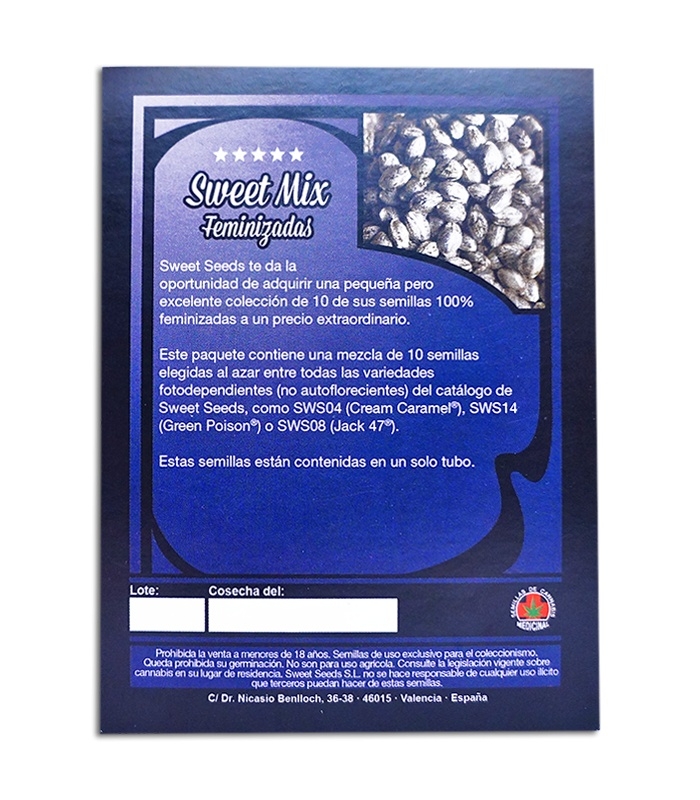 В коллекцию Sweet Mix Feminizadas входит 10 стабильных феминизированных фотопериодных семян. Это отличная возможность для увлеченных гроверов вырастить разнообразные по вкусу, воздействию и генетическому составу семена. Насладиться легендарными сортами чемпионами и попробовать уникальные новинки, еще не представленные широкой публике!