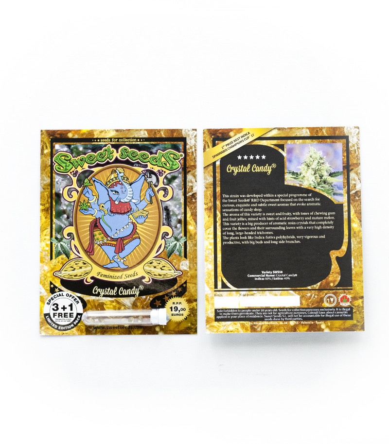 Сорт Crystal Candy – это еще один сладкий сорт испанской компании Sweet Seeds. Бридеры SS всегда обращали внимание на вкусо-ароматические характеристики сортов (что и отраженно в названии компании «Сладкие Семечки»).