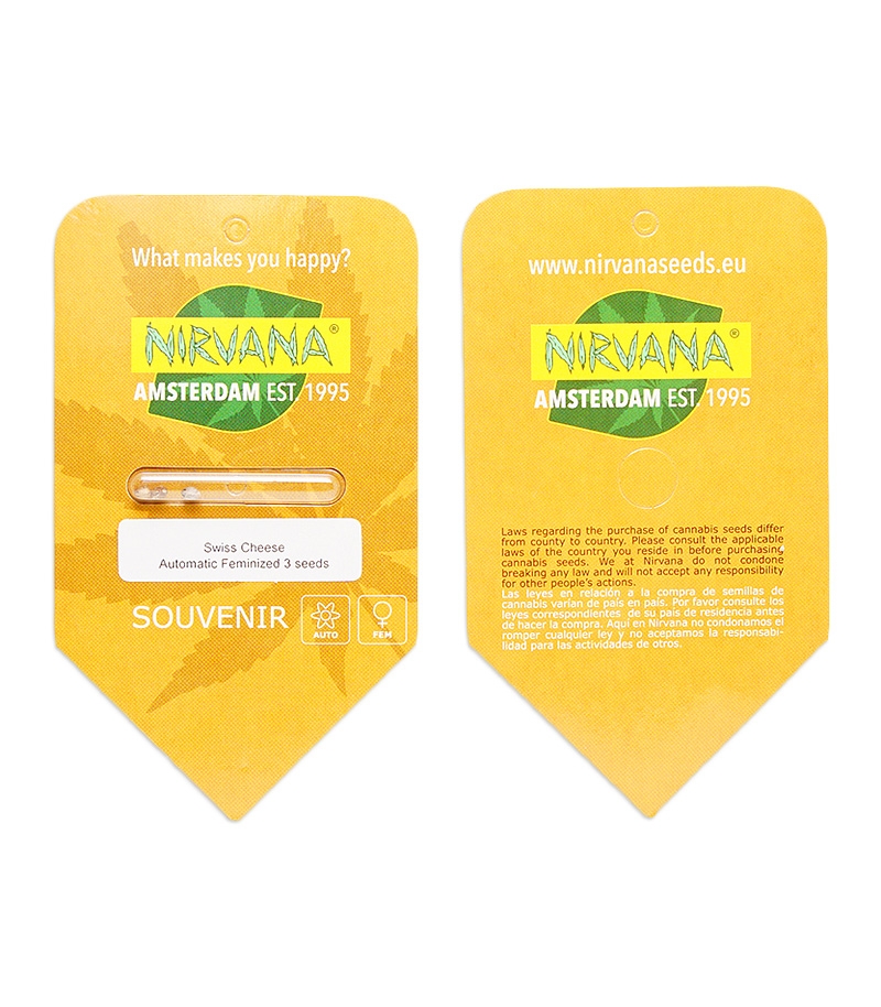 Семена конопли Swiss Cheese Auto fem от Nirvana. Низкое неприхотливое растение с сильным запахом швейцарского сыра. Отлично подходит для маленьких гроубоксов.