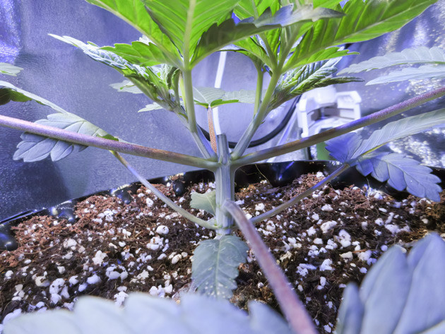 Теперь я перешел к мейн линингу. Моя задача – сформировать четыре главных стебля с каждой стороны куста. Сделал еще один топпинг на вновь образовавшихся ветвях на уровне третьего этажа. На втором ярусе удалил точки роста, чтобы направить энергию на верхушки. Затем разогнул все восемь ветвей и закрепил их растяжками из мягкой проволоки. Моя задача – сделать крону, насколько это возможно, плоской, прежде чем переводить растение в цвет. Время не поджимает, у меня в запасе еще несколько недель. Компот по прежней схеме, плюс добавил 0,26 мл/л Floralicious Plus.
